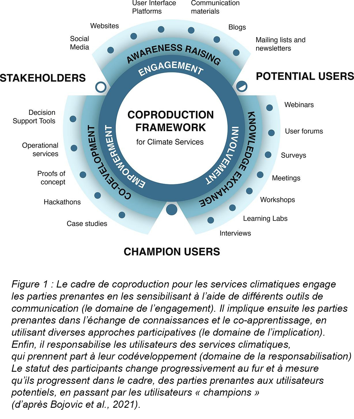 Il s’agit donc de construire les cadres nécessaires pour cocréer des recherches transdisciplinaires avec l’ensemble des parties prenantes, acteurs académiques issus de plusieurs disciplines et engagés dans les recherches interdisciplinaires, acteurs socio-économiques et décideurs. Ces enjeux sont au cœur des objectifs du projet ciblé DIALOG du PEPR TRACCS. Cette coproduction peut prendre de nombreuses formes comme le suggèrent Bojovic et al. (2021) (Fig.1).